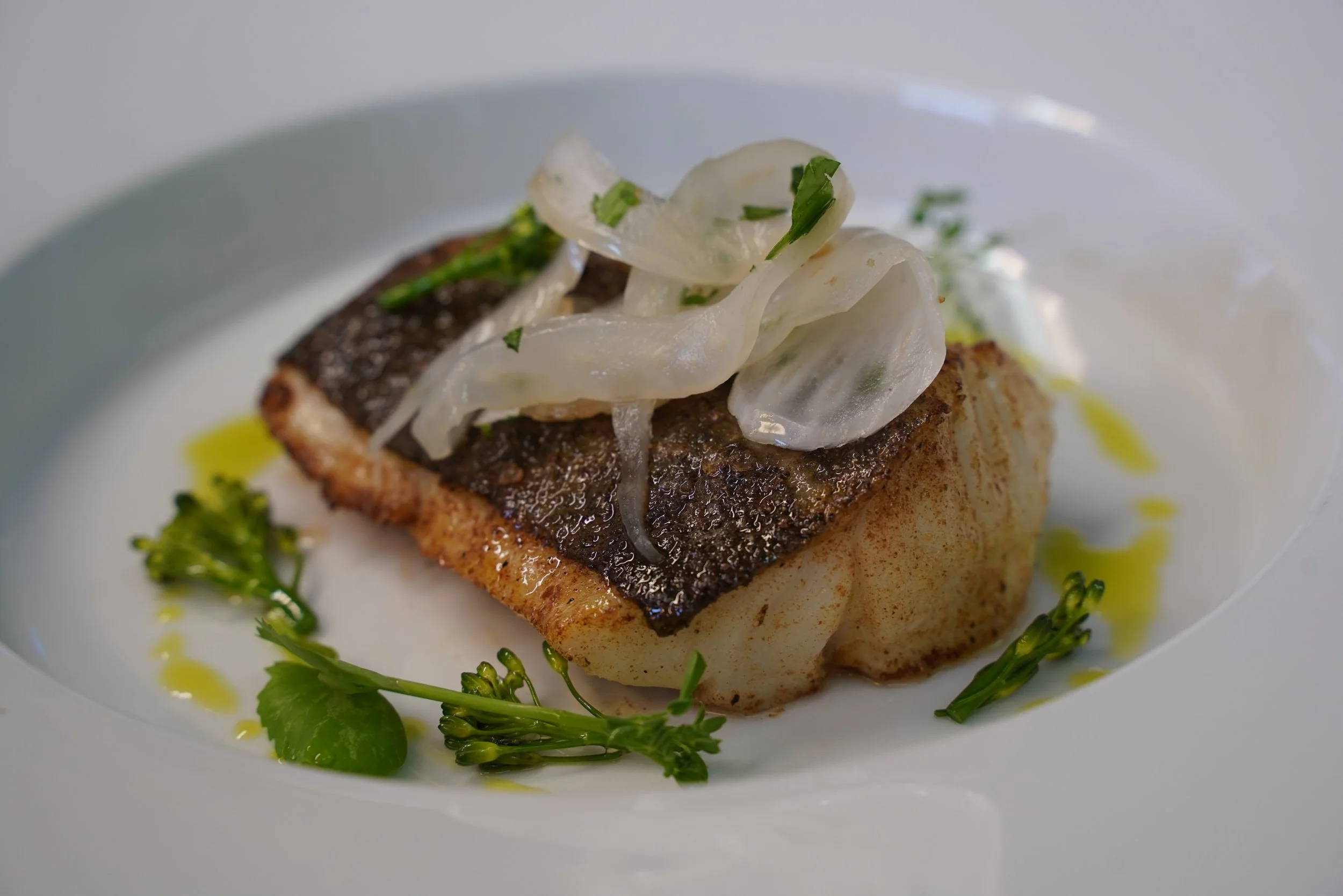 spisskål, fritert kapers, gulrotkrem, hvitvin-urtesaus, urtebakte poteter og tomat confite Allergen: fisk, gluten, laktose, hvitløk, løk